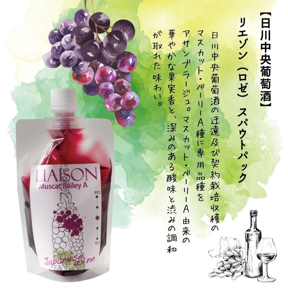 日川中央葡萄酒が誇るリエゾン(赤)は、契約栽培されたマスカット・ベーリーA種から生まれた特別な逸品です。このスパウトパックは、持ち運びに便利なデザインが魅力。一般的なワイングラス2杯分の飲み切れる120mlのサイズです。